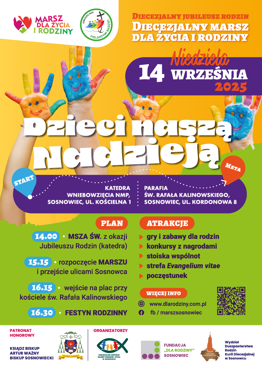 W niedzielę 14 września 2025 o godz. 14:00 w katedrze pw. Wniebowzięcia NMP w Sosnowcu (ul. Kościelna 1) Ksiądz Biskup Artur Ważny będzie sprawował Mszę św. z okazji Diecezjalnego Jubileuszu Rodzin. Do udziału w uroczystości zapraszamy całe rodziny: rodziców z dziećmi, dziadków, młodzież i dorosłych. Pielgrzymka do katedry i udział w Eucharystii jest związany z możliwością uzyskania odpustu jubileuszowego.